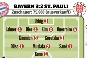 体育资讯3月30日讯 拜仁在本轮德甲3-2险胜圣保利,《图片报》也在赛后为球员进行了评分。